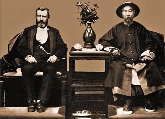 1879年,美国前总统格兰特与李鸿章。两人见面之后,格兰特受李鸿章之托前往日本,调停因日本并吞琉球而发生的两国纠纷,但未能成功。