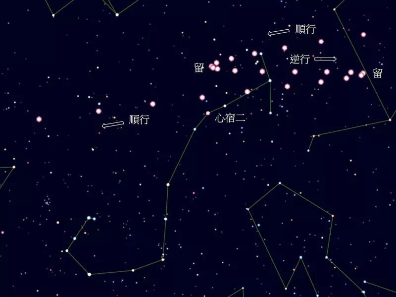 中国古代星占家认为火星在位置及亮度上都常变不定,谓之“荧惑”,象征残、疾、丧、饥、兵等恶象。上图中的荧惑守心天象,是指火星在心宿内发生“留-逆行-留”的现象,在古代中国被认为大凶。