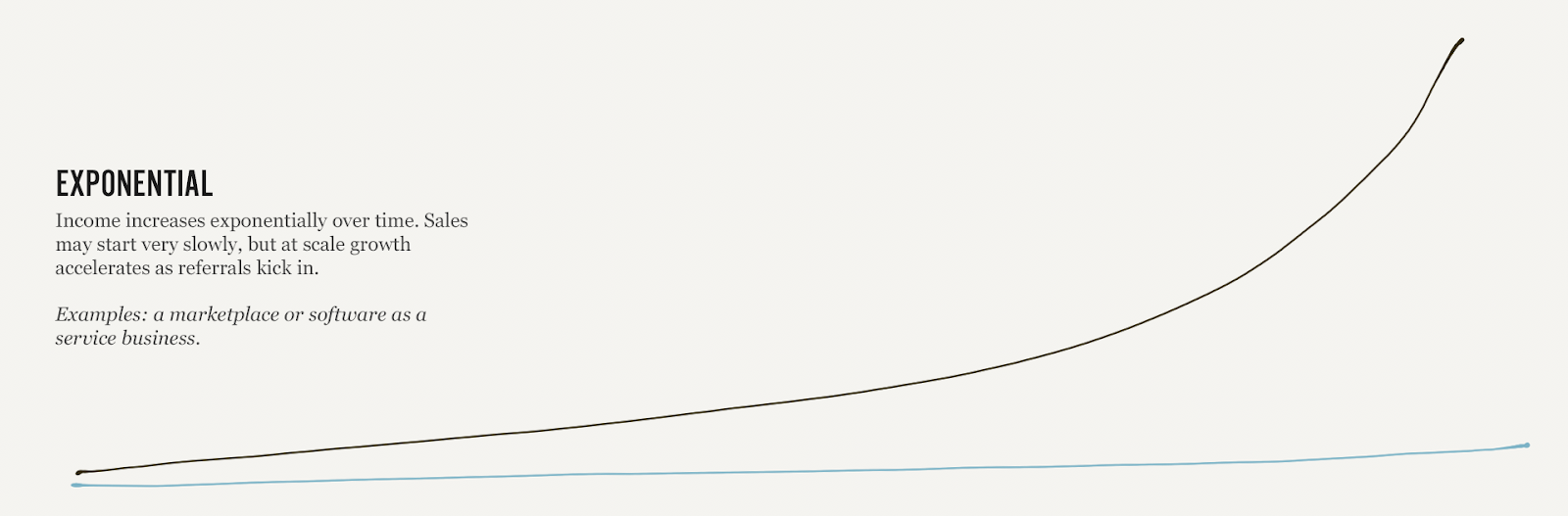 指数式增长来自于,产品的每一次销售,都使下一次销售更容易。它需要一个你可以重复销售的产品(无论是实物还是数字产品),可以大规模地创造。这意味着你不可能是在卖你的时间。