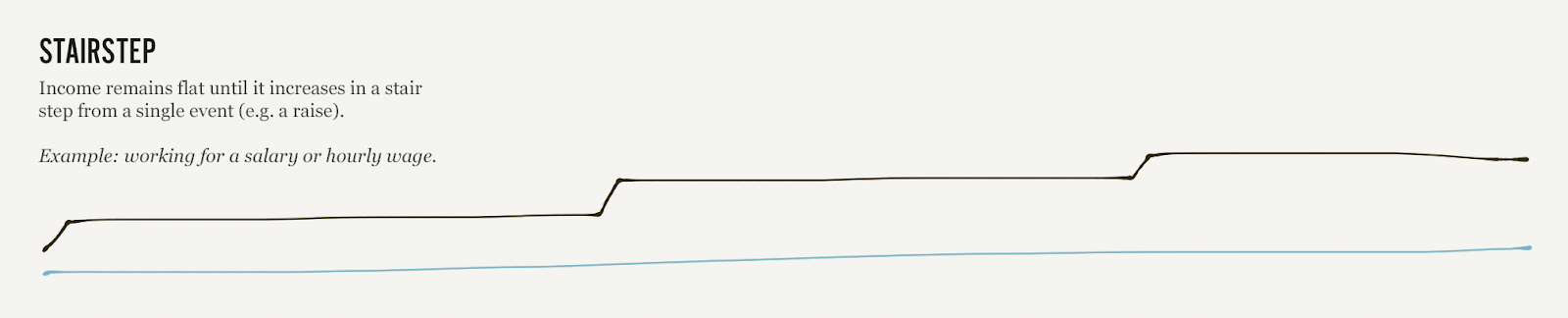 大多数人在生活中会经历一个阶梯式的收入增长方式。他们从零时工的职位转到一个全职岗位,伴随着加薪,这是收入的一个台阶。然后每一次额外的加薪是另一个台阶。在一些职业中,这些台阶可能是小而频繁的,在另一些职业中,可能会在更长的时间内间隔开来,而且是相当大的阶梯(实习医师到正式医生或成为律师事务所的合伙人)。